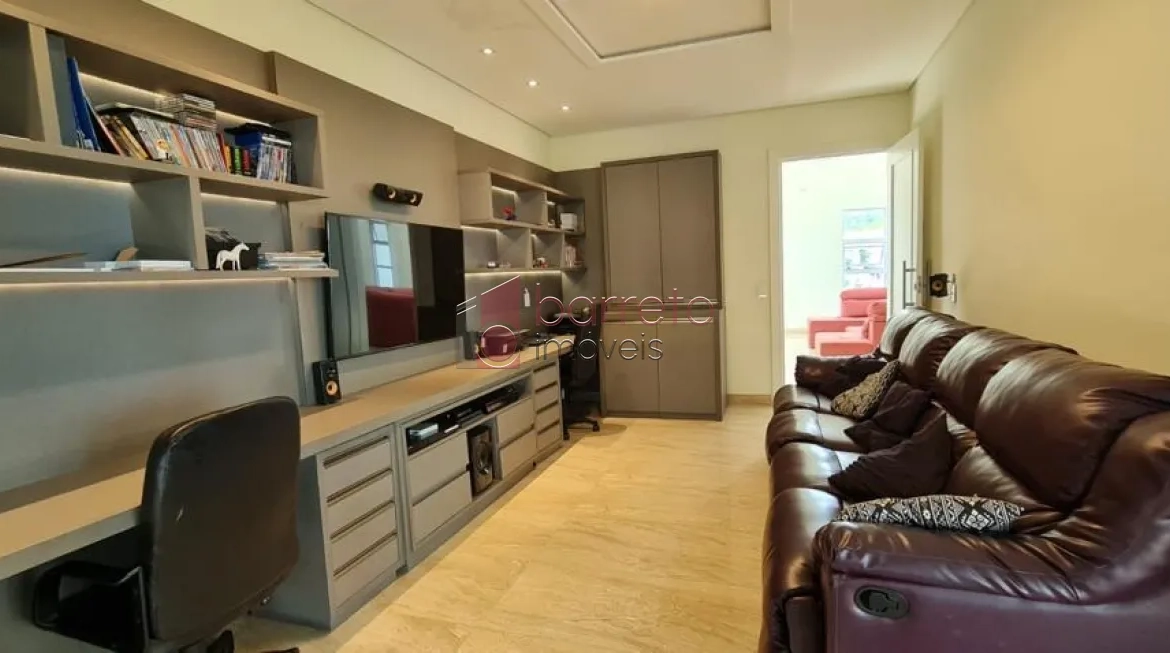 Casa com 482m² de área construída. Contém: 04 suítes com armários e ar condicionado, (sendo 01 master com closet e hidro), roupeiro, sala 02 ambientes com pé direito alto e lareira a gás, jardim de inverno, escritório, home theater com armários planejados, cozinha com ilha, mesa de granito e armários planejados, despensa, área de serviço, quarto de serviço, espaço gourmet integrado à cozinha, com balcão, armários e painel de TV, 02 banheiros externos, piscina com cascata e jacuzzi com hidro, campo de futebol, 09 Vagas, sendo 04 cobertas.