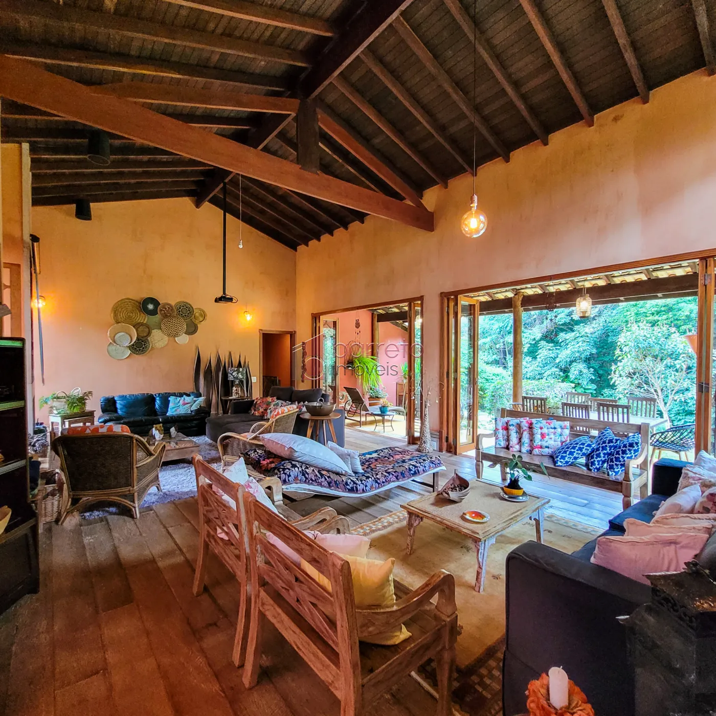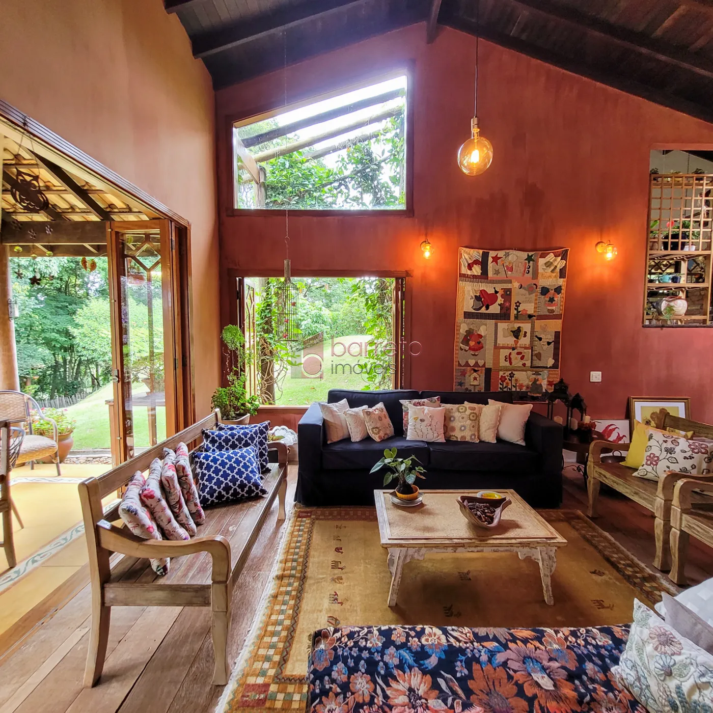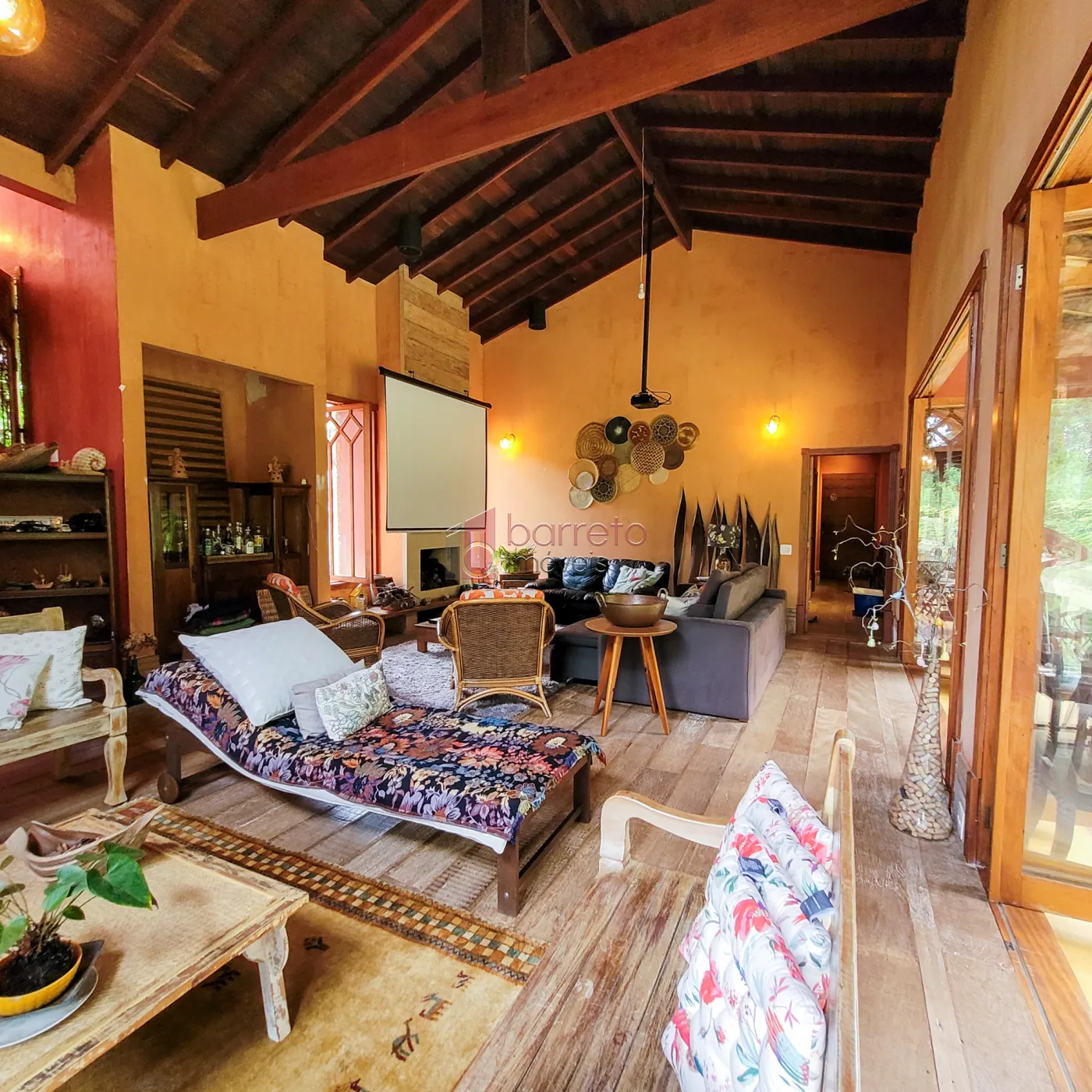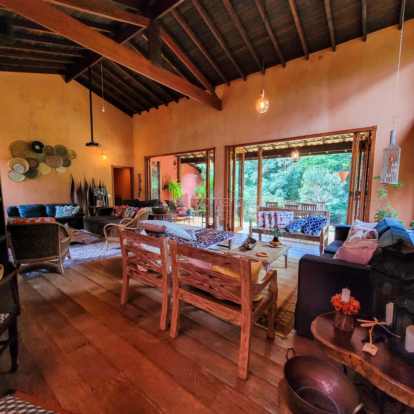 – Sala de estar com lareira e amplas portas de correr, com visão para a mata;