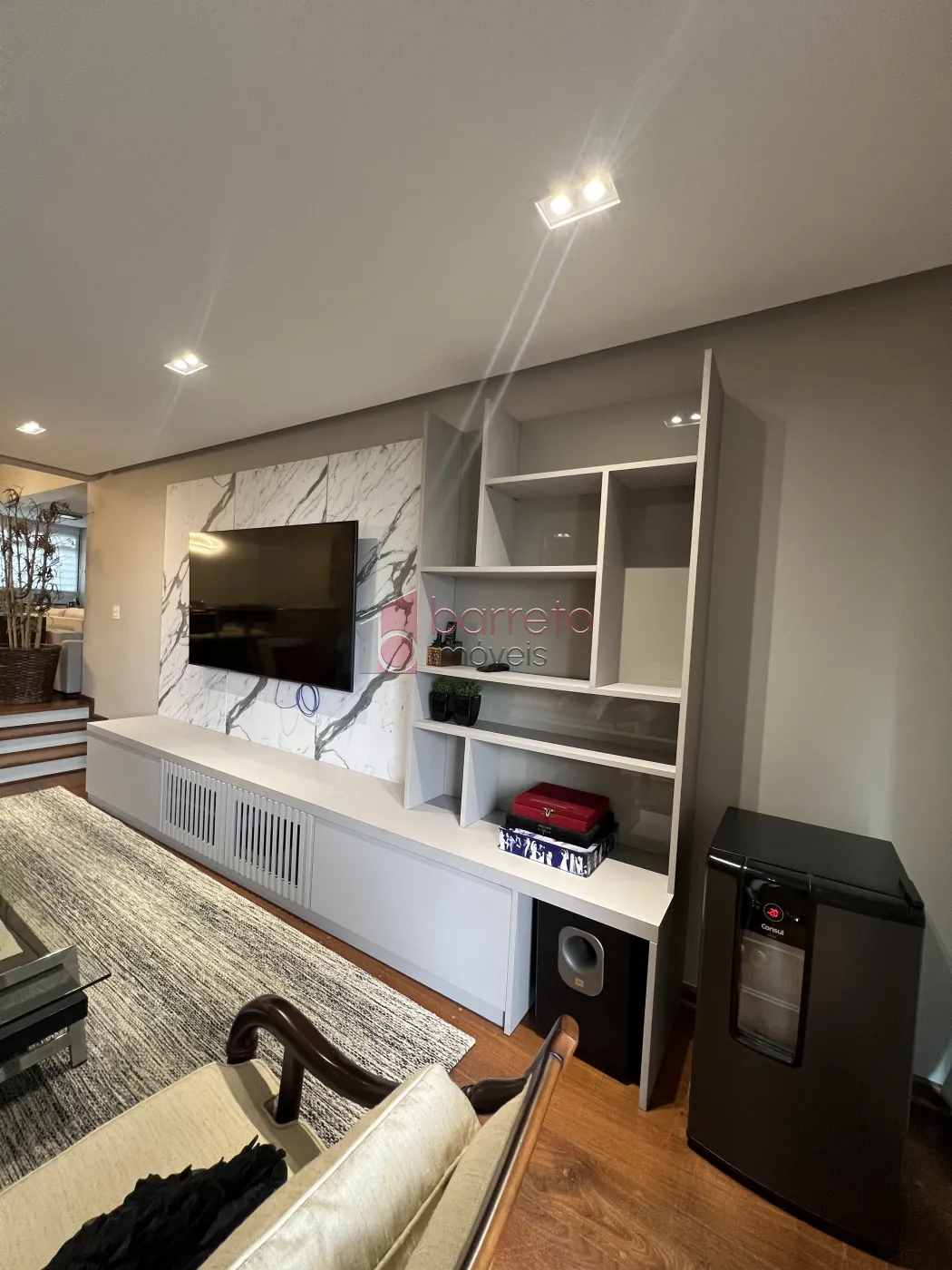 Os acabamentos são de excelência, com piso em madeira maciça, lareira revestida em granito italiano, forro em gesso com iluminação por spots embutidos e mobiliário planejado de alto padrão, conferindo sofisticação e conforto a todos os ambientes.