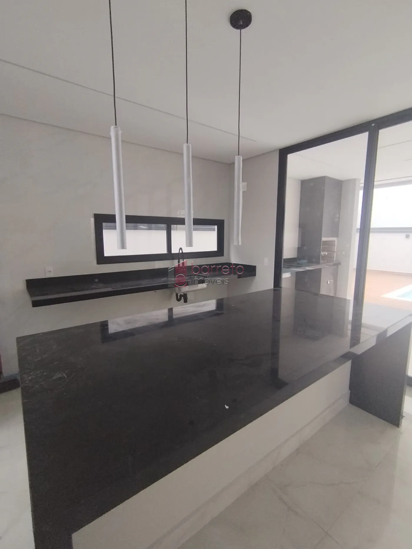 – Sala de jantar ampla com piso porcelanato, bancada Preto São Gabriel e esquadrinhas pretas;
