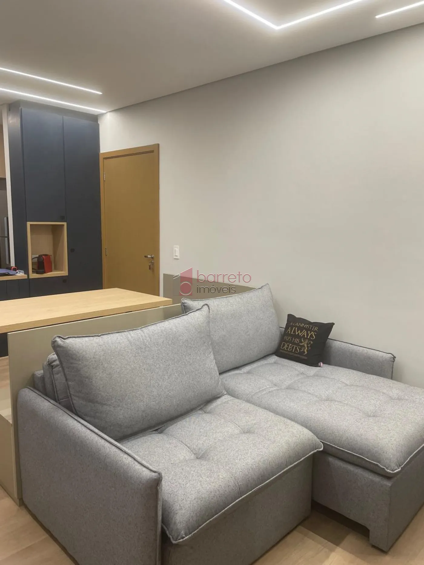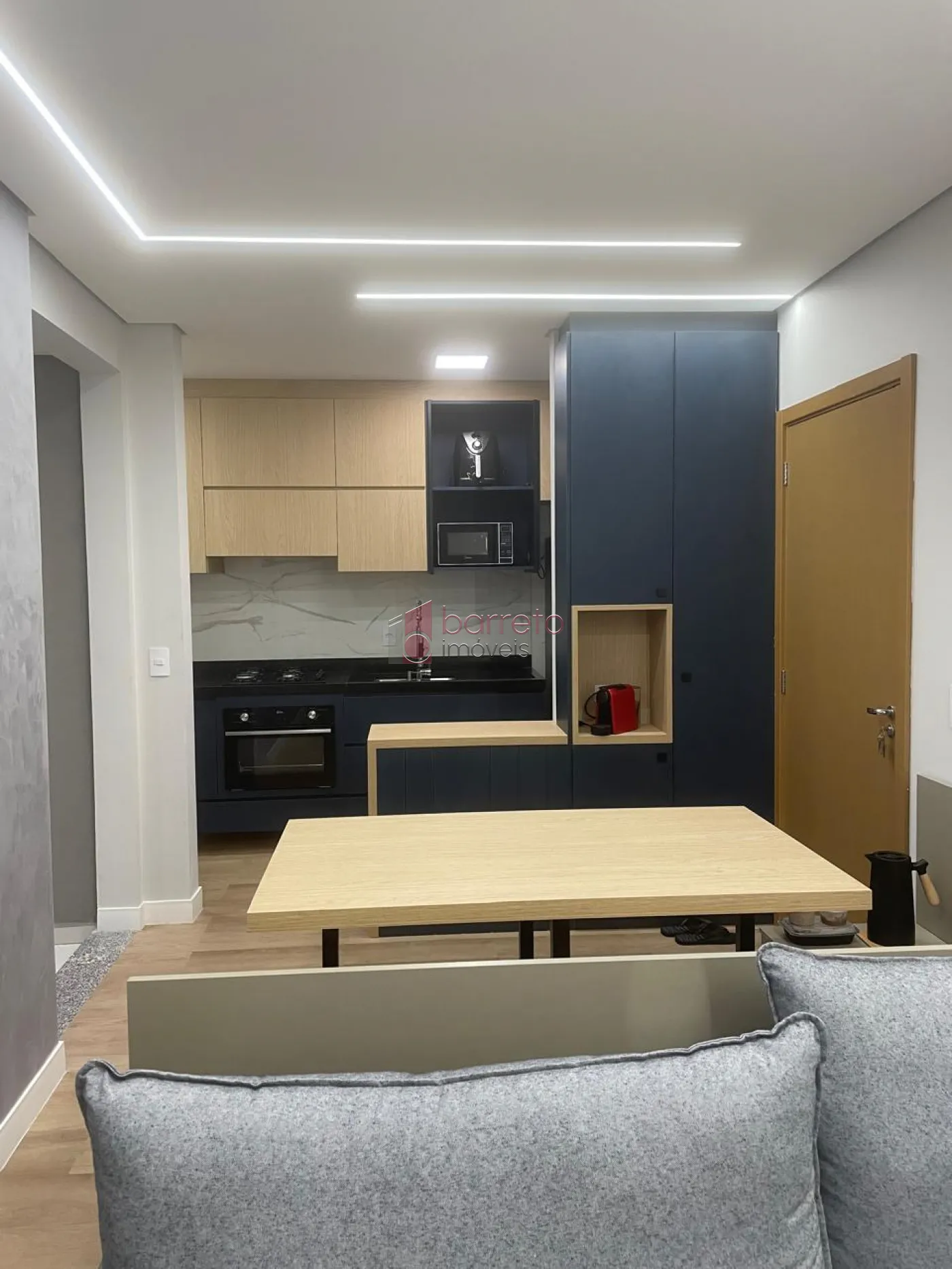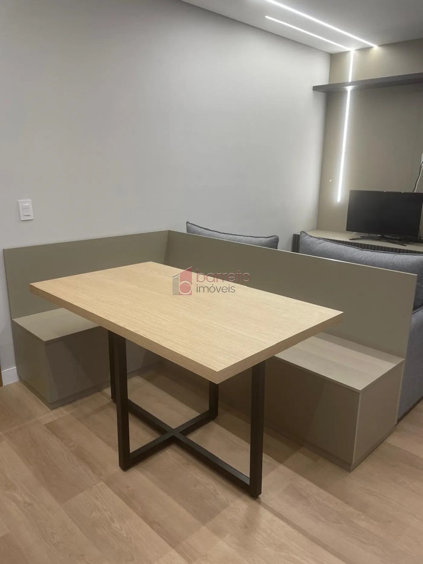– Sala dois ambientes com planejados, sofá e canto alemão;