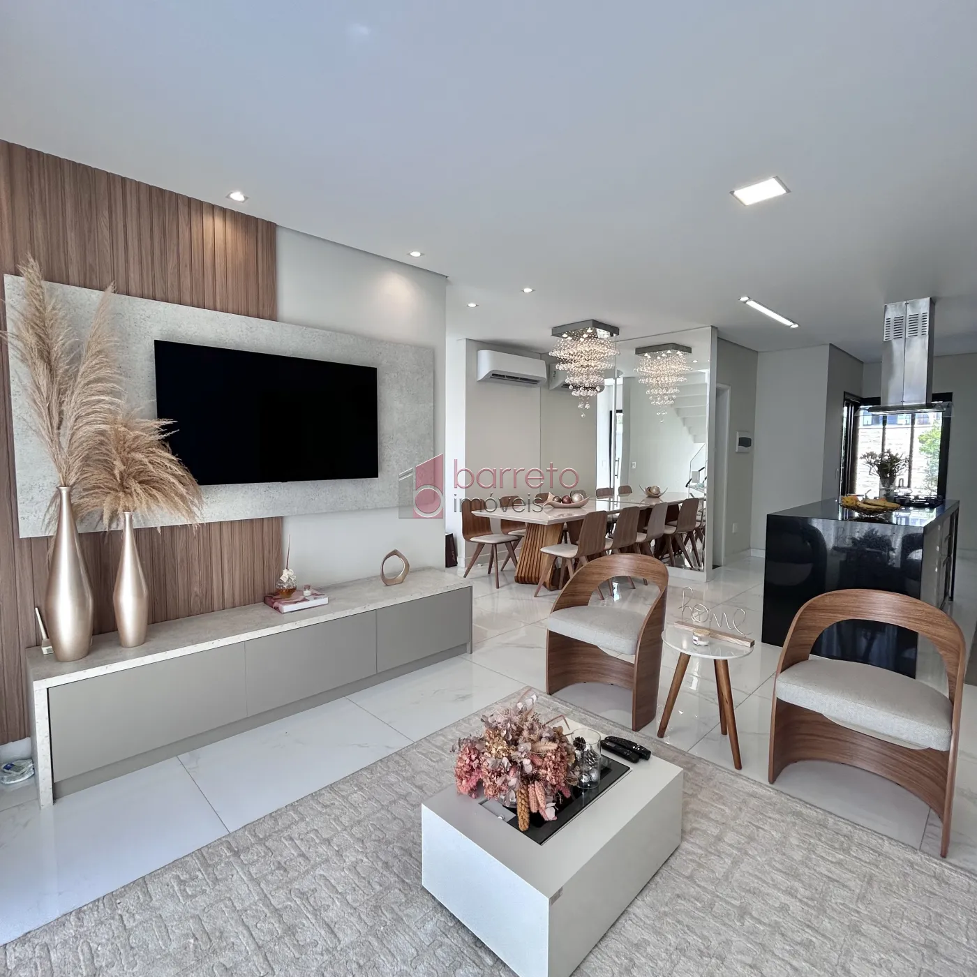 A área social é composta por 01 sala de estar aconchegante, com sofá e poltronas, além de uma sala de jantar elegante, com lustre, espelho, mesa para 06 lugares e ar-condicionado. A cozinha está equipada com geladeira, cooktop, forno, coifa e 02 banquetas, oferecendo praticidade e conforto no dia a dia. A escada que liga os ambientes conta com um lustre decorativo, agregando sofisticação ao espaço.