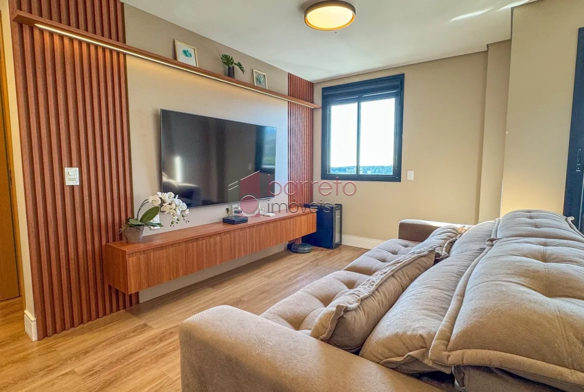 Apartamento com 95 m² de área útil, 02 dormitórios com armários, sendo 01 suíte, sala ampliada, podendo retornar o 3º dormitório, banheiro social, sala para 02 ambientes, cozinha com planejados, área de serviço com armário, varanda gourmet com vista para a Serra do Japi, 02 vagas de garagem no subsolo, box de 4m².