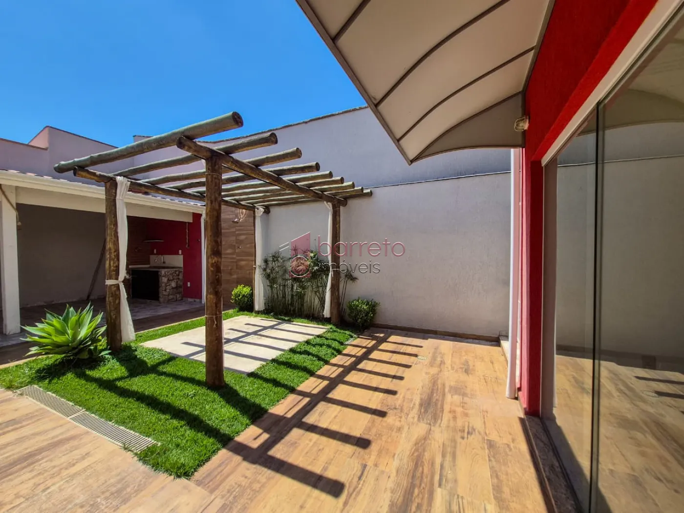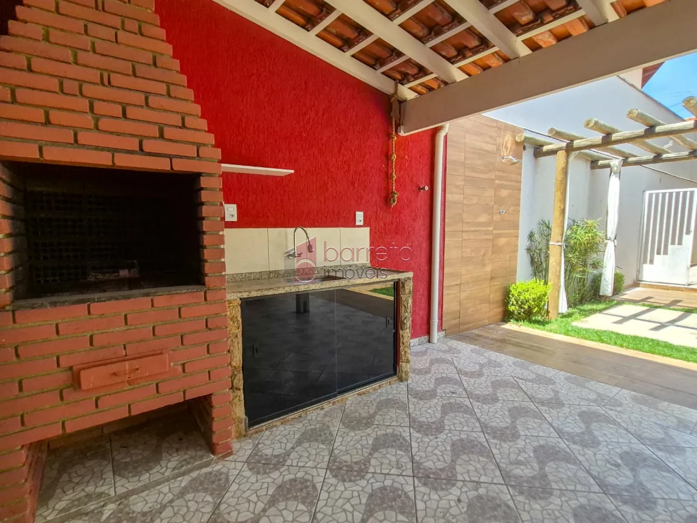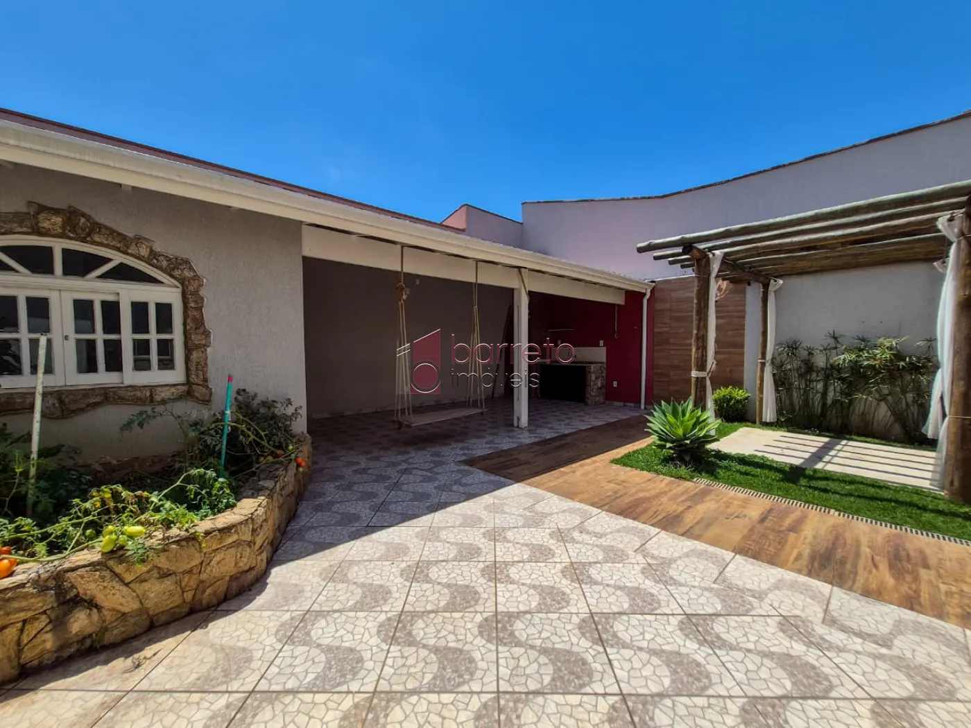 Quintal com área gourmet, mini horta, churrasqueira, lavanderia, banheiro e um lindo pergolado.