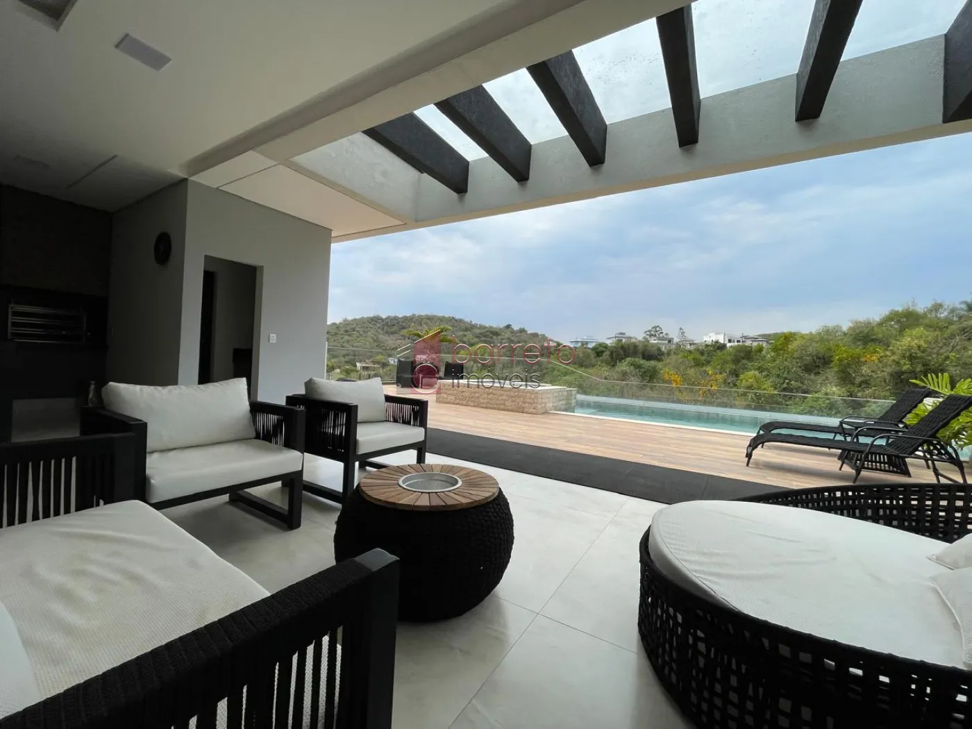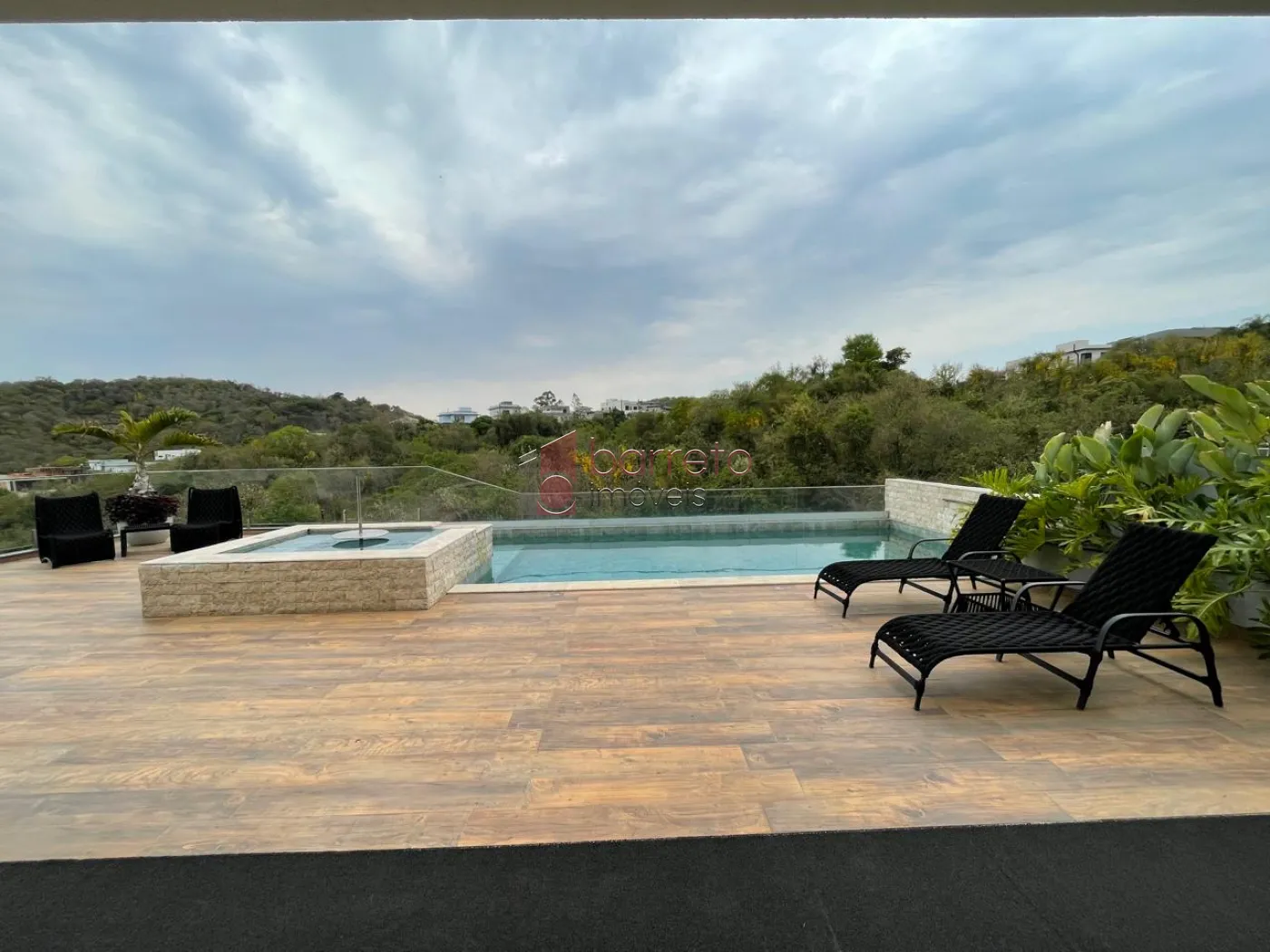Área externa com uma espaçosa área gourmet equipada, piscina com hidromassagem e cascata (com infraestrutura pronta para aquecimento), armário de ferramentas e 03 vagas de garagem cobertas.