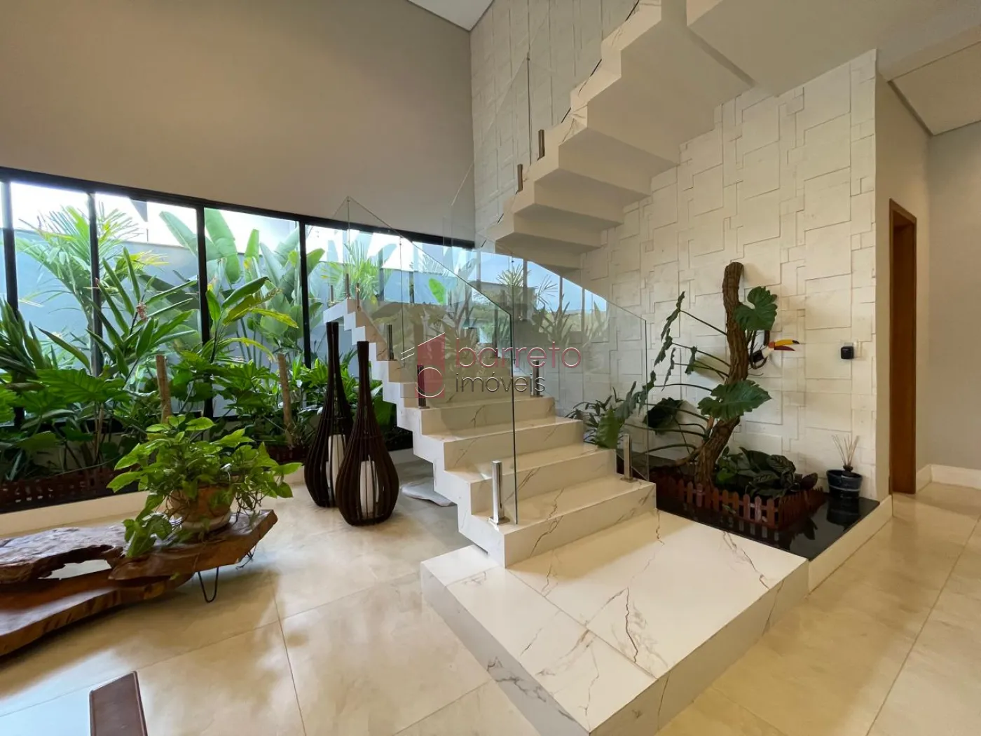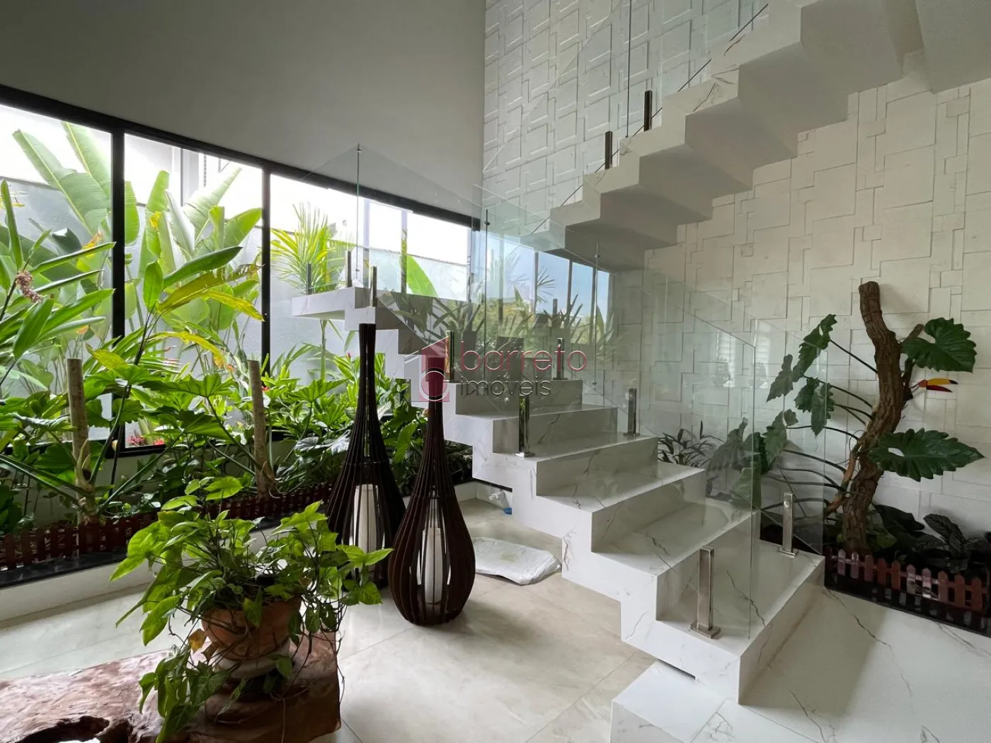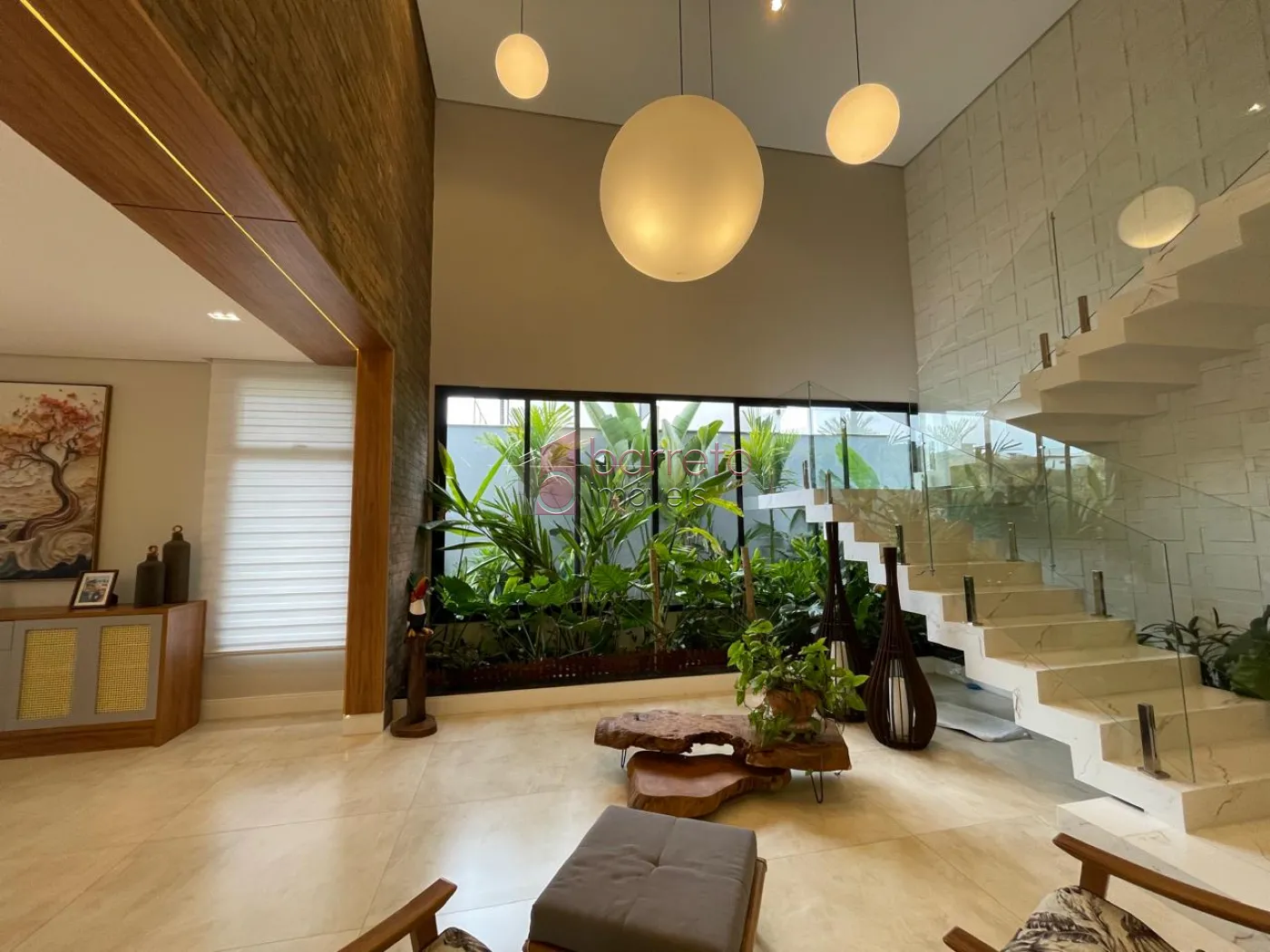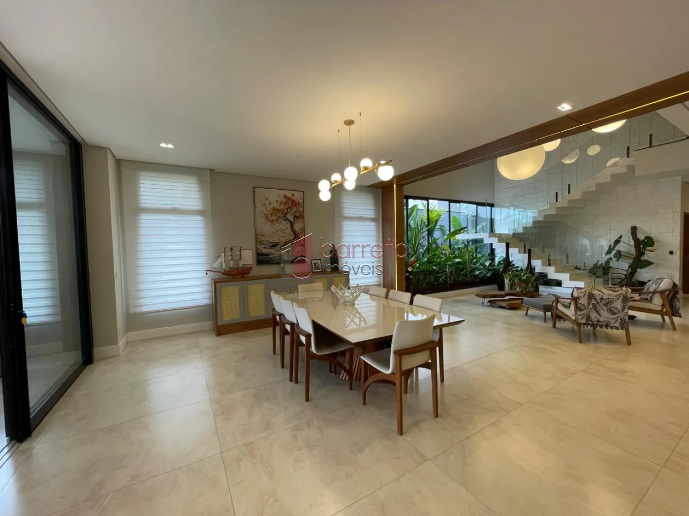 Piso superior: 03 suítes, sendo 02 master com closet, uma delas com banheira e chuveiro duplos, além de um escritório, sala de TV e antessala. Piso inferior: 01 suíte com acessibilidade, salas amplas, jardim natural interno, lavabo, cozinha com despensa, sala de jantar e lavanderia, todos os ambientes com móveis planejados.