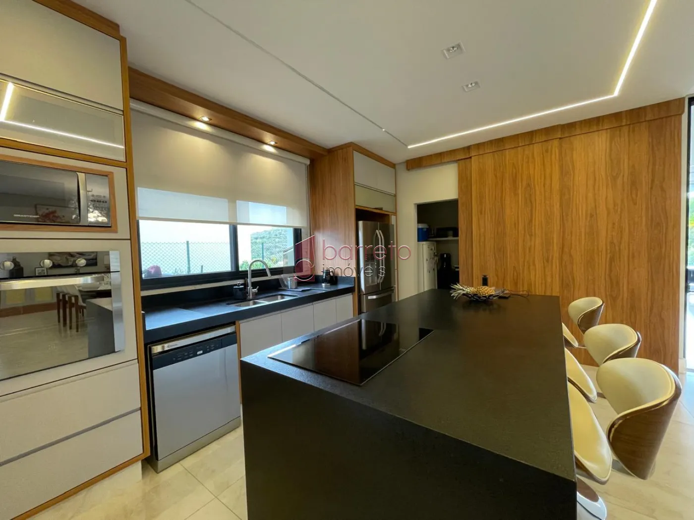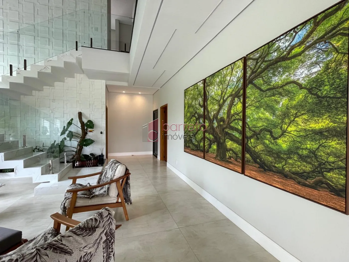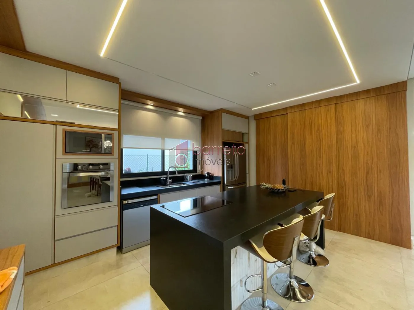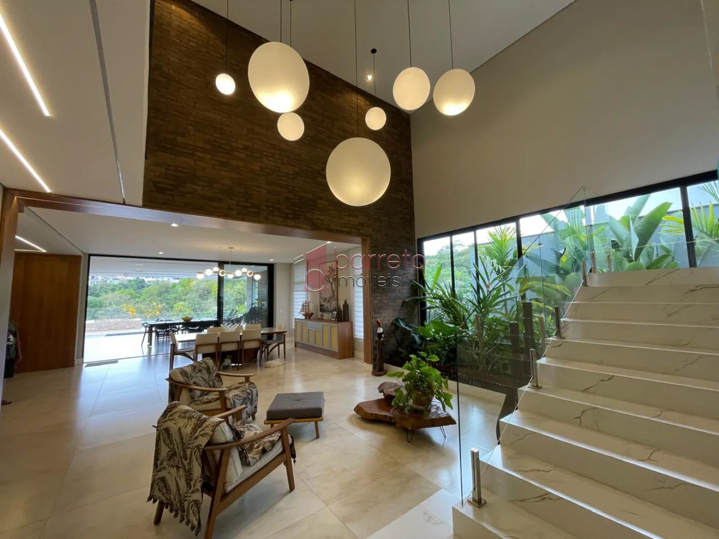 Piso superior: 03 suítes, sendo 02 master com closet, uma delas com banheira e chuveiro duplos, além de um escritório, sala de TV e antessala. Piso inferior: 01 suíte com acessibilidade, salas amplas, jardim natural interno, lavabo, cozinha com despensa, sala de jantar e lavanderia, todos os ambientes com móveis planejados.