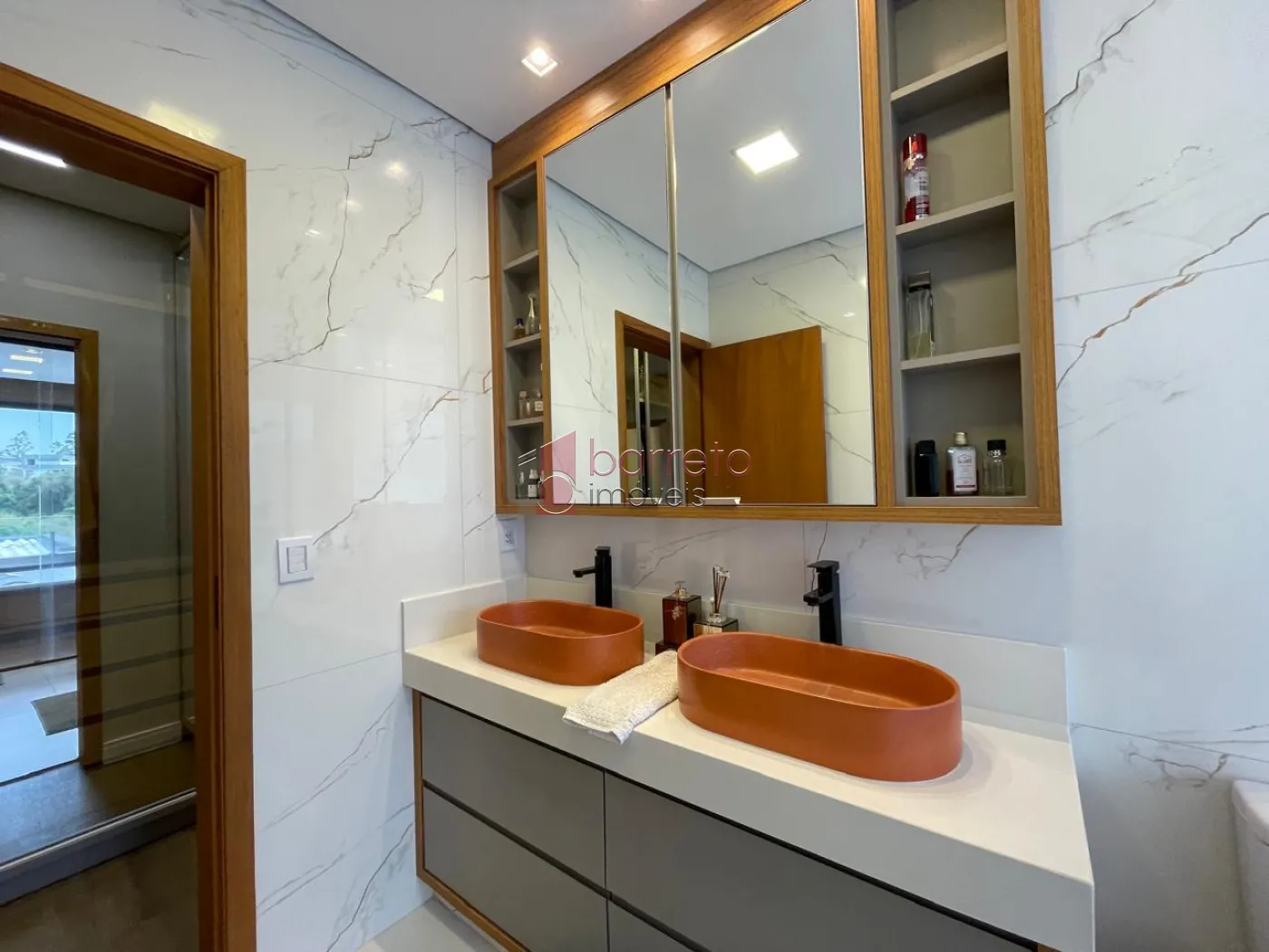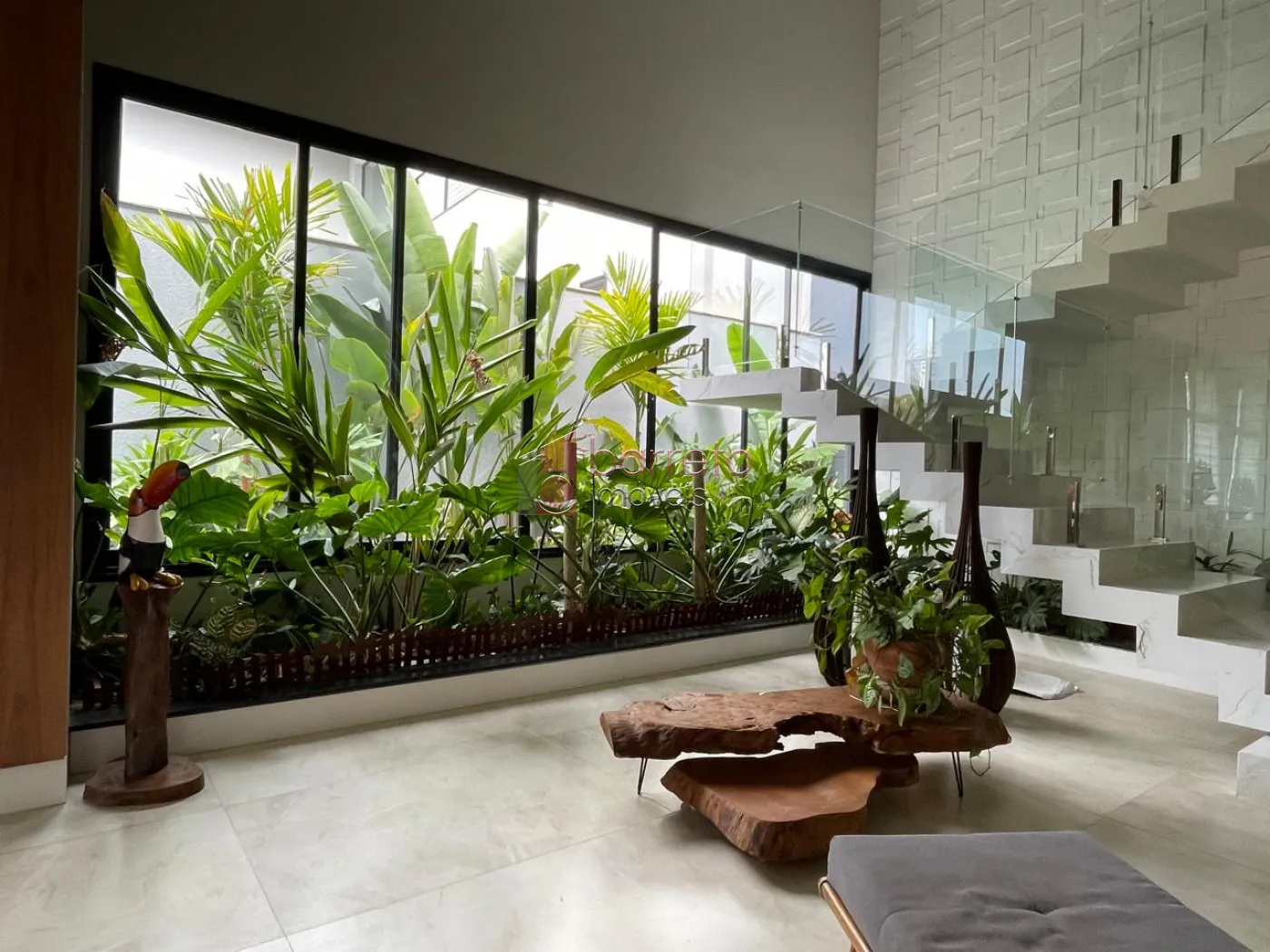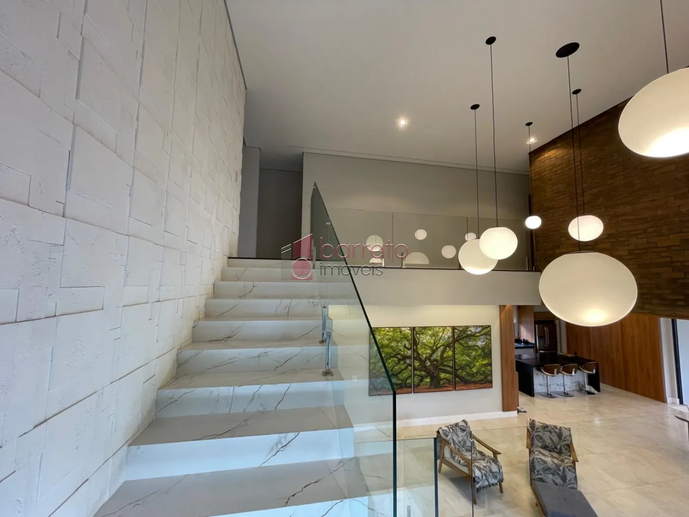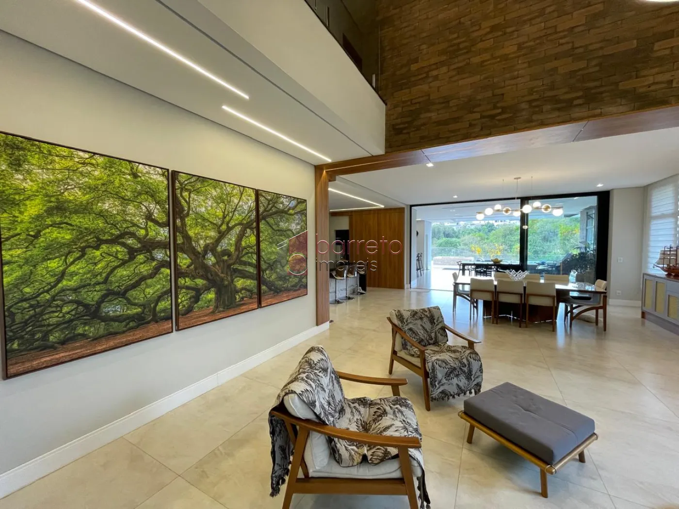 Piso superior: 03 suítes, sendo 02 master com closet, uma delas com banheira e chuveiro duplos, além de um escritório, sala de TV e antessala. Piso inferior: 01 suíte com acessibilidade, salas amplas, jardim natural interno, lavabo, cozinha com despensa, sala de jantar e lavanderia, todos os ambientes com móveis planejados.